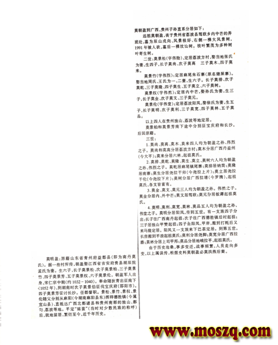 近阅莫秀珠编<<莫姓系谱>>, 发现贵州支系和广西南丹支系, 与我族系谱大体相同(见图), 特借莫氏宗亲网, 寻找以上地区同门宗亲。
